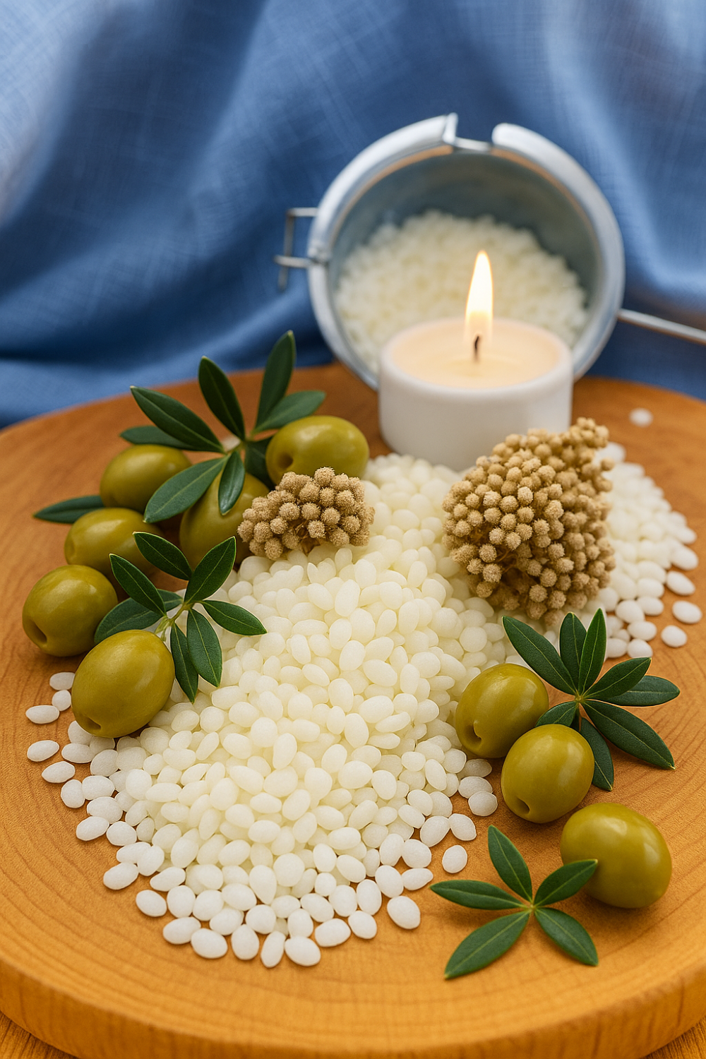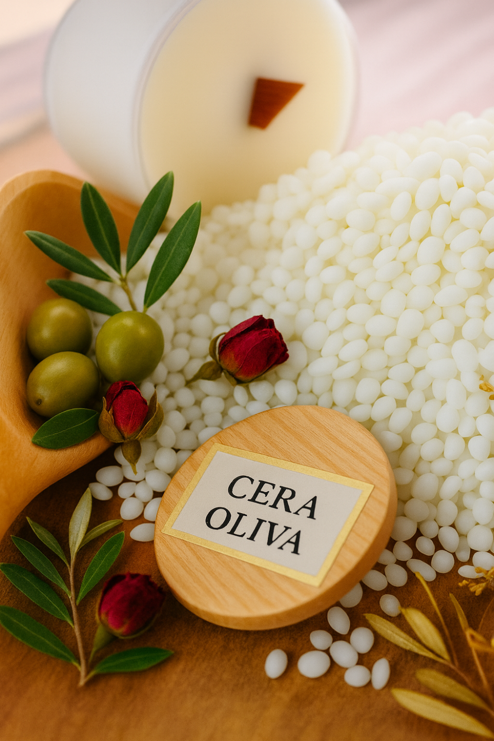 La cera de oliva es fácil de trabajar y produce velas con una excelente liberación de aromas gracias a su bajo punto de fusión. Su textura suave y cremosa también le da a las velas un aspecto atractivo.